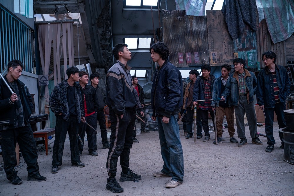 배경은 <콘크리트 유토피아>와 동일합니다. 어느 날 원인 불명의 대지진이 일어나고 세상의 문명이 거의 멸망한 가운데, 생존자들은 황궁 아파트에 모여 살아가고 있습니다. 그리고 현금 대신 햄 통조림이 화폐의 기능을 하고 있습니다. (햄 통조림은... 쉽게 말해 스팸입니다, 이 영화에서는 거의 노골적인 PPL에 가까울 정도로 '런천미트'가 강조되어 사용됩니다)